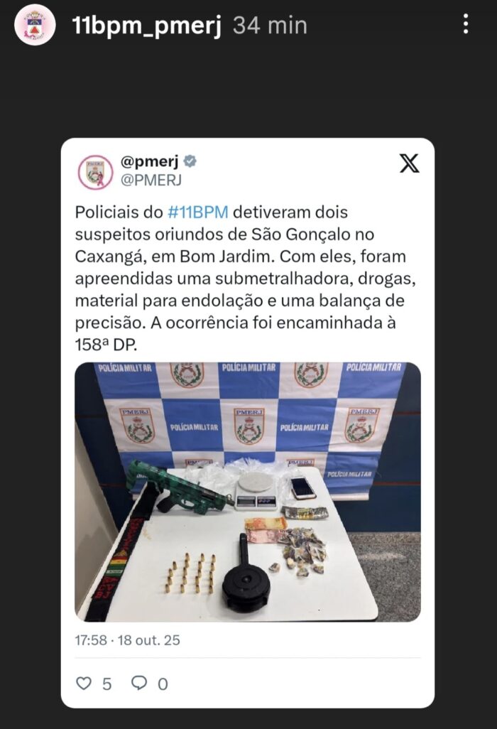A informação foi publicada pelo próprio 11º BPM em suas redes sociais na tarde deste sábado, 18/10.