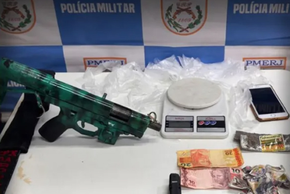 Além da submetralhadora e munições, os policiais militares também apreenderam drogas, material para endolação de entorpecentes e uma balança de precisão.