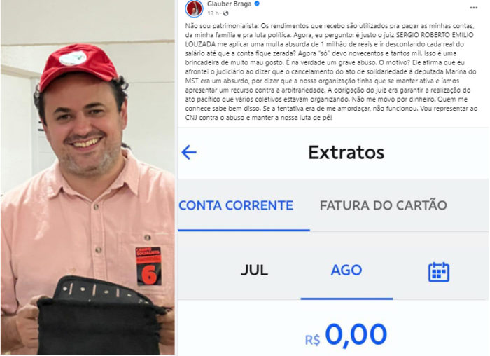 Não sou patrimonialista. Os rendimentos que recebo são utilizados pra pagar as minhas contas, da minha família e pra luta política. Agora, eu pergunto: é justo o juiz SERGIO ROBERTO EMILIO LOUZADA me aplicar uma multa absurda de 1 milhão de reais e ir descontando cada real do salário até que a conta fique zerada? Agora “só” devo novecentos e tantos mil. Isso é uma brincadeira de muito mau gosto. É na verdade um grave abuso. O motivo? Ele afirma que eu afrontei o judiciário ao dizer que o cancelamento do ato de solidariedade à deputada Marina do MST era um absurdo, por dizer que a nossa organização tinha que se manter ativa e íamos apresentar um recurso contra a arbitrariedade. A obrigação do juiz era garantir a realização do ato pacífico que vários coletivos estavam organizando. Não me movo por dinheiro. Quem me conhece sabe bem disso. Se a tentativa era de me amordaçar, não funcionou. Vou representar ao CNJ contra o abuso e manter a nossa luta de pé!