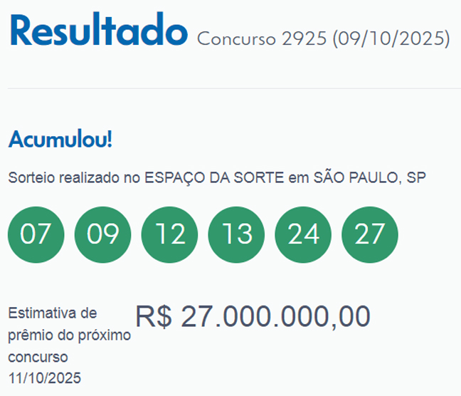 PRÊMIO PRINCIPAL ACUMULA E VAI PARA R$ 27 MILHÕES –