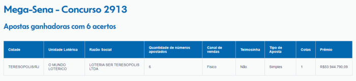 De acordo com o site oficial da Caixa Econômica Federal, a aposta simples realizada em Teresópolis foi feita na loteria “O mundo lotérico”.