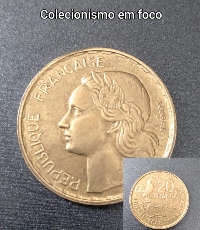 A coluna da semana traz para os leitores essa linda moeda francesa de 20 Francos do ano de 1951, período da quarta república (1944 – 1959). Cunhada em Alumínio/bronze, pesa 4 gramas, diâmetro 23,5 mm e foi gravada por Georges Guiraud.