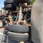 VEÍCULO TINHA PNEU CARECA, PROVÁVEL CARGA COM EXCESSO DE PESO E ÚLTIMO LICENCIAMENTO EM 2019 – Uma carreta tombou na RJ-116, principal acesso à região Centro-Norte Fluminense. O acidente chegou a interditar a rodovia nos dois sentidos na manhã desta quarta-feira, 7/2, e está funcionando em sistema de pare e siga na altura do km 10.3, no território de Itaboraí. Após o transbordo da carga, será iniciado operação para destombar o veículo. O acidente quase provocou uma tragédia na RJ-116. Motoristas que cruzaram a rodovia no momento do fato afirmaram que a carreta desgovernada colocou em risco a vida de