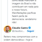 CLÁUDIO CASTRO DIZ QUE SERÁ “ENÉRGICO” CONTRA QUALQUER MANIFESTAÇÃO QUE NÃO RESPEITE O PATRIMÔNIO PÚBLICO E PRIVADO – No Rio de Janeiro, Cláudio Castro (PL), reeleito pela mesma legenda de Bolsonaro, afirmou no Twitter que as cenas vistas em Brasília neste domingo, 8/1, “mancham a imagem do Brasil” e disse ser “contra toda e qualquer manifestação que não respeite os patrimônios público e privado”. “Em um ambiente democrático, as cenas que vemos em Brasília são inadmissíveis. Atitudes como essas mancham a imagem do Brasil e não contribuem em nada para o nosso futuro. Manifestações pacíficas fazem parte da democracia, vandalismo