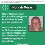 A cooperativa médica Unimed Serrana RJ divulgou nesta segunda-feira, 9/1, através de suas redes sociais, nota de pesar pelo falecimento do conhecido otorrinolaringologista Otto José Stransky, de 75 anos. Segundo a nota, ele dedicou 30 anos de sua carreira à cooperativa, inclusive, como conselheiro. “Nos solidarizamos com toda a família e amigos do Dr. Otto José Stransky pelo seu falecimento. Dos 75 anos de vida, mais de 30 foram dedicados ao exercício da medicina em nossa cooperativa como otorrinolaringologista e conselheiro”, diz a íntegra do comunicado. A Unimed Serrana RJ não divulgou outras informações.