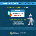 IMUNIZAÇÃO COMEÇA NESTA SEXTA-FEIRA, 22/7, EM QUATRO LOCAIS – A partir desta sexta-feira, 22/7, as crianças com quatro anos poderão receber a primeira dose da vacina contra a covid-19 em Nova Friburgo, conforme autorização e recomendação do Ministério da Saúde. A informação foi divulgada pela SECOM (Subsecretaria de Comunicação) da Prefeitura. A vacinação ocorrerá nas salas de vacina das Unidades Básicas de Saúde do Suspiro e Olaria das 8h às 18h e em Conselheiro Paulino e São Geraldo, das 8h às 16h. Atenção: É necessário ter em mãos os seguintes documentos: CPF ou cartão do SUS e caderneta de vacina.