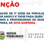 TAMBÉM NÃO HAVERÁ VACINAÇÃO DA 3ª DOSE PARA QUEM TEM MAIS DE 18 ANOS NESTA QUINTA-FEIRA, 9/6 por SECOM / PREFEITURA Em nota oficial publicada em suas redes sociais e no site oficial, a Prefeitura de Nova Friburgo informou que está suspensa a vacinação contra a covid-19 da 3ª dose para quem tem mais de 18 anos e ainda a 4ª dose para quem tem mais de 50 anos. O governo municipal acrescentou que, oportunamente, irá divulgar novo calendário para estes dois públicos. NOTA OFICIAL DA PREFEITURA DE FRIBURGO “Devido a problemas logísticos na retirada e transporte das vacinas do