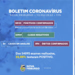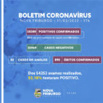 MUNICÍPIO REGISTRA MAIS 119 TESTES POSITIVOS E TEM 59 INTERNADOS – De acordo com boletins divulgados pela Prefeitura nesta quinta-feira, 10/2, Nova Friburgo registrou mais 3 mortes por covid-19. Em fevereiro, são 16 óbitos (durante todo mês de janeiro foram 8). O número de óbitos durante a pandemia passou para 894. A Prefeitura informou ainda que mais 119 pessoas testaram positivo para covid na quinta-feira. No total, foram realizados 383 testes. O número leva em consideração apenas os dados dos Centros de Triagens vinculados ao SUS. Ainda nesta quinta-feira, Nova Friburgo tinha 59 pacientes internados com covid nos hospitais público