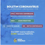 De acordo com boletins divulgados nesta segunda-feira, 7/2, a Prefeitura informou que mais 564 pessoas testaram positivo para covid nos últimos três dias: 207 na segunda, 7/2; 134, no domingo, 6/2; e 223, no sábado, 5/2. Os números levam em consideração apenas os dados dos Centros de Triagens vinculados ao SUS. Ainda nesta segunda-feira, Nova Friburgo tinha 65 pacientes internados com covid nos hospitais público e particulares. Sendo 48 em leitos de enfermaria e 17 em CTIs. “Por problemas técnicos (sistema de informação), não foi possível atualizar o Boletim de Covid-19 na data de hoje 07/02/2022. Porém, a Secretaria de