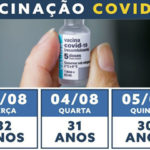 A Prefeitura de Nova Friburgo anunciou o novo calendário de vacinação (1ª dose) contra a covid-19. A imunização estava suspensa temporariamente em virtude da falta de vacinas, mas será retomada com a chegada de novos imunizantes neste sábado, 30/7. O primeiro da lista é a idade de 33 anos. NOVO CALENDÁRIO. Na segunda-feira, 2 de agosto, quem tem 33 anos poderá receber o imunizante contra a covid-19.. Na terça-feira, 3 de agosto, o calendário continua para os cidadãos com 32 anos.. Na quarta-feira, 4 de agosto, os contemplados são os friburguenses com 31 anos.. Na quinta-feira, 5 de agosto, quem