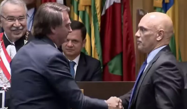 O presidente da República, Jair Bolsonaro, e o ministro Alexandre de Moraes, do Supremo Tribunal Federal (STF), se cumprimentaram ao participarem nesta quinta-feira, 19 de maio, de cerimônia de posse de ministros do Tribunal Superior do Trabalho (TST), em Brasília.
