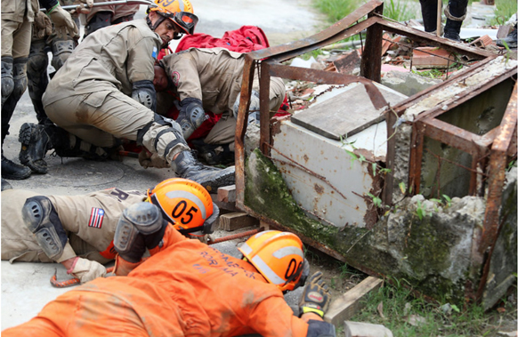 A prática aconteceu no 2º Grupamento de Socorro Florestal e Meio Ambiente, em Magé, e incluiu atividades de busca superficial em estruturas colapsadas, técnica de chamada e escuta, busca com cães, rompimento de estruturas de concreto e também sinalização para localização de vítimas.