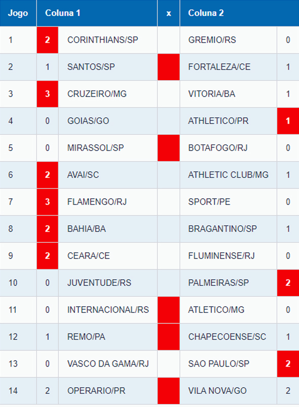 Outras 218 apostas acertaram treze jogos e cada uma delas receberá o valor de R$ 1.550,28.