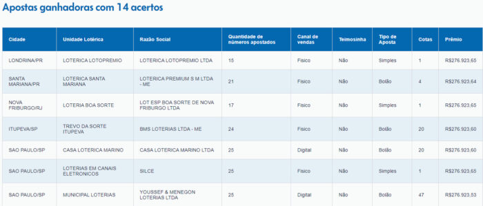 Os jogos do referido concurso foram realizados no final de semana (veja abaixo) e o prêmio principal divulgado nesta segunda-feira, 3/11, será dividido por sete ganhadores – todos têm direito ao prêmio de R$ 276 mil.