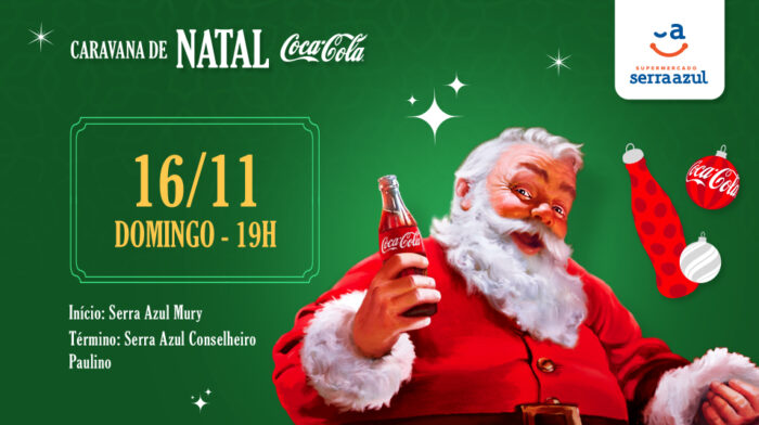 SUPERMERCADO SERRA AZUL – No domingo, 16/11, é a vez da Caravana de Natal da Coca-Cola marcar presença, circulando de Mury e Conselheiro Paulino, via Centro. Desta vez, a parceria é com a rede de supermercados Serra Azul.