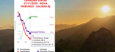 MÍNIMA É UMA DAS MAIS BAIXAS DO PAÍS NESTE DIA DE PRIMAVERA, DE ACORDO COM O INMET – Fez frio em Friburgo no amanhecer desta sexta-feira, 21 de novembro, em especial na zona rural do município De acordo com o Inmet, a estação meteorológica de Salinas, no 3º distrito, aferiu 6.7 graus – com sensação térmica de 8.1 graus. O alvorecer foi marcado pela presença do sol, claro, além do friozinho de Primavera. A temperatura de 6.7 graus é uma das mais baixas do país nesta sexta-feira. A previsão é que a temperatura chegue a 25 graus no decorrer do