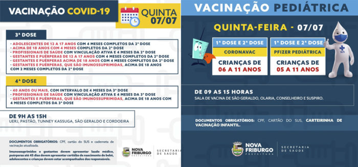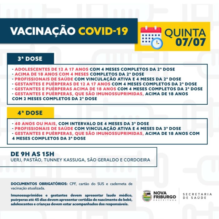 A Prefeitura ampliou a vacinação contra a Covid-19 de quarta e terceira dose em Nova Friburgo. Nesta quinta-feira, 7/7, a população com mais de 40 anos, profissionais de saúde, gestantes e puérperas que são imunossuprimidas e possuem o aprazamento necessário poderão receber a quarta aplicação.