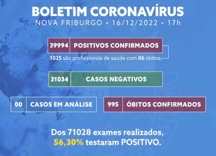 Os novos boletins oficiais da Prefeitura de Nova Friburgo – relativos ao período de 10 a 16 de dezembro – sobre a covid-19, divulgados nesta sexta-feira, 16/12, informam que o município registrou mais dois óbitos relacionados ao coronavírus.