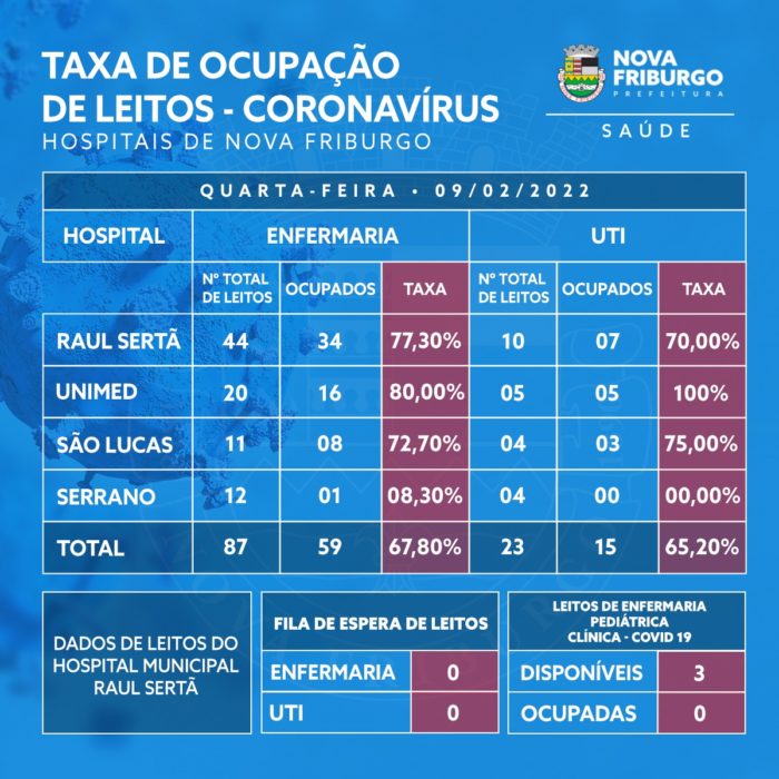 Ainda nesta quarta-feira, Nova Friburgo tinha 74 pacientes internados com covid nos hospitais público e particulares. Sendo 59 em leitos de enfermaria e 15 em CTIs.