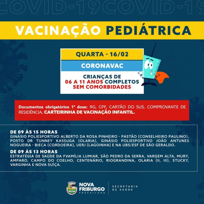 A Secretaria Municipal de Saúde de Nova Friburgo vacina todas as crianças com mais de 6 anos, sem comorbidade ou deficiência permanente, nesta quarta-feira, 16.