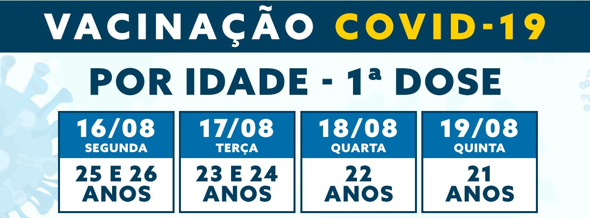 Na segunda-feira, 16/8, quem tem 26 e 25 anos receberá a primeira dose. Na terça, 17/8, é a vez de quem tem 24 e 23 anos. Na quarta, 18/8, a idade contemplada será os 22 anos, e na quinta, 19/8, os friburguenses com 21 anos receberão a vacina.