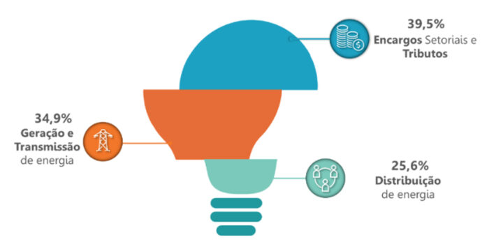 Sendo assim, em uma conta cujo valor final é R$ 100, por exemplo, 34,9%, ou seja, R$ 34,90 vão para as empresas responsáveis pela geração e transmissão de energia. A maior parte, 39,5%, é destinada ao pagamento de encargos e impostos cobrados pelos governos federal, estadual e municipal, inclusive a contribuição de Iluminação Pública, que é repassada integralmente às prefeituras assim como o valor da bandeira tarifária, estipulado pela Aneel.