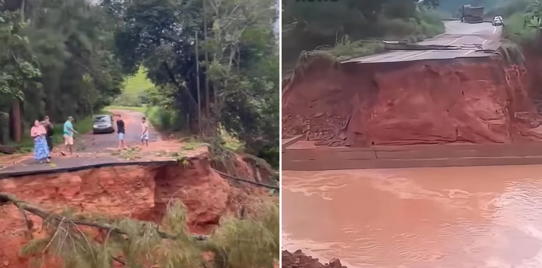 Na altura de Euclidelândia, a rodovia foi literalmente cortada ao meio, com um trecho arrastado pela enxurrada. A estrada está totalmente interditada e não há previsão de liberação.
