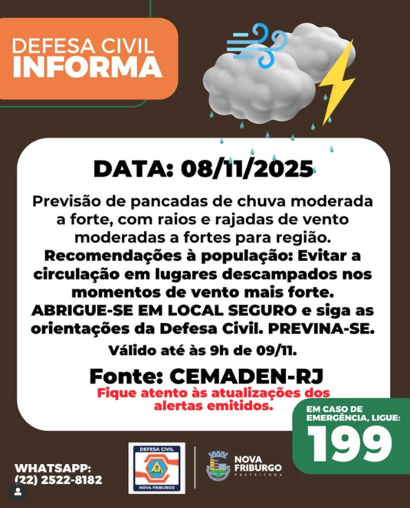 O fim de semana – 8 e 9 de novembro – é marcado por um aviso meteorológico divulgado pela Secretaria de Defesa Civil do Estado do Rio – e repostado pelo mesmo órgão em Nova Friburgo.