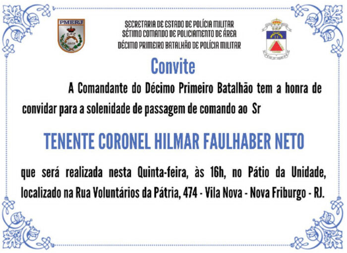 Em comunicado à imprensa, o porta-voz do 11º BPM divulgou convite para a troca de comando. nesta quinta-feira, 27/3, na sede do batalhão. O novo comandante é o tenente-coronel Hilmar Faulhaber Neto. A transmissão de comando está marcada para às 16h.