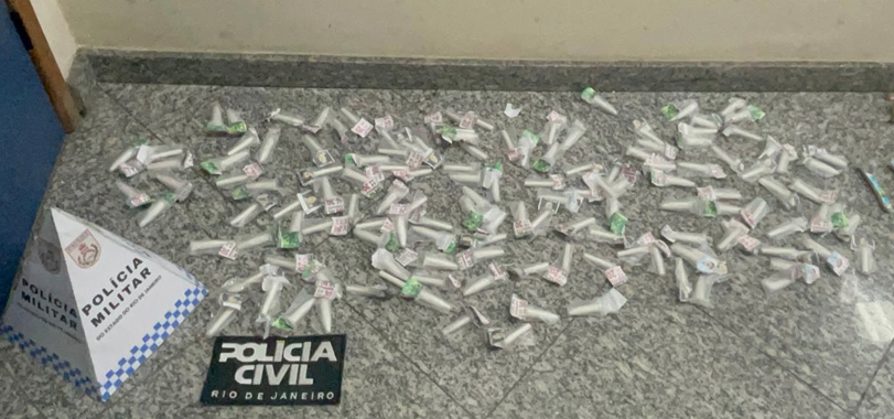 Três indivíduos foram presos, em flagrante, acusados de envolvimento com o tráfico de drogas na Rua Santa Catarina, no bairro de Olaria, na quarta-feira, 16/7.