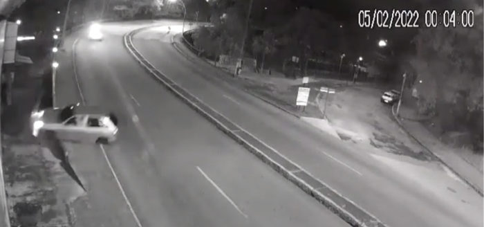 Imagens dignas de um filme de emoção foram registradas neste final de semana em Nova Friburgo. Uma das câmeras de segurança na descida do Viaduto Geremias Mattos Fontes, sentido Paissandu / Bairro Ypu, flagrou a perseguição de uma viatura policial a um veículo com, pelo menos, quatro ocupantes que teve desfecho em frente à escola de samba Unidos da Saudade.