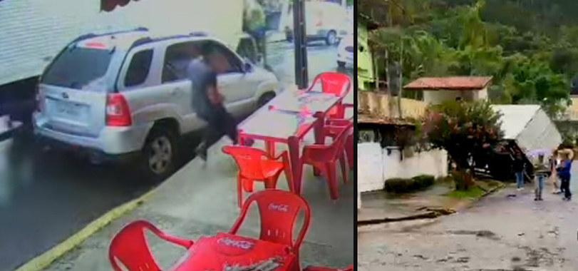 Um vídeo gravado por câmeras de segurança mostra o instante em que um ocupante pula da cabine do caminhão desgovernado descendo a Rua Uruguaiana em Nova Friburgo, que arrastou um veículo onde estavam uma mãe e a filha de 6 anos. A criança morreu no local e a mãe ficou gravemente ferida.
