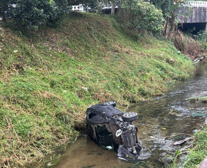 Um veículo particular caiu dentro do Rio Cônego, em Olaria, na madrugada deste sábado, 31/5.