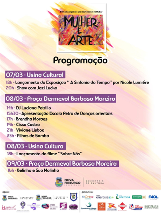 No dia 8 de março, a programação se concentra na Praça Dermeval Barbosa Moreira, com apresentações musicais e a presença de instituições que oferecem suporte e informação às mulheres, como o Centro de Referência da Mulher (CREM), DEAM Nova Friburgo, Conselho Municipal dos Direitos da Mulher, Tecle Mulher e Secretaria da Mulher.