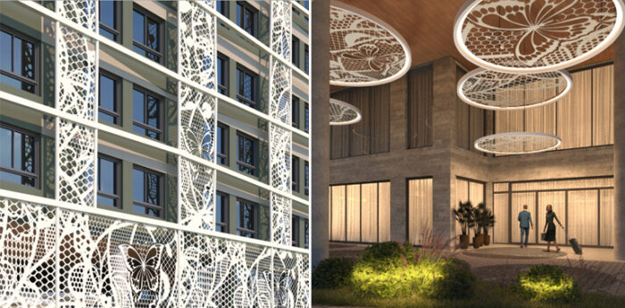 O uso de iluminação estratégica valoriza os detalhes do painel à noite, criando um efeito luminoso elegante e dinâmico. Por outro lado, durante o dia, o sol através da “renda” projetará uma textura na parte interna do hotel.