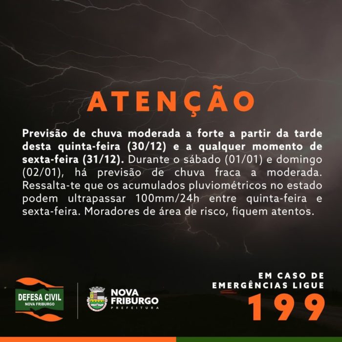A Secretaria Municipal de Defesa Civil, através das redes sociais da Prefeitura, emitiu alerta sobre a possibilidade de pancadas de chuva moderada a forte nas próximas horas em Nova Friburgo. O alerta vale até o final de semana. Em caso de emergência, disque 199.