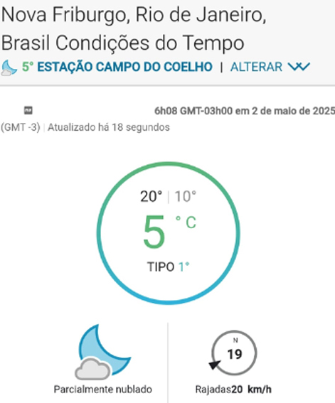 De acordo com o Instituto Friburgo Solidário – que tem vários termômetros espalhados pela zona rural de Nova Friburgo – o equipamento do distrito de Campo do Coelho, no 3º distrito, aferiu a temperatura mínima de 5 graus no alvorecer desta sexta-feira, 2/5.