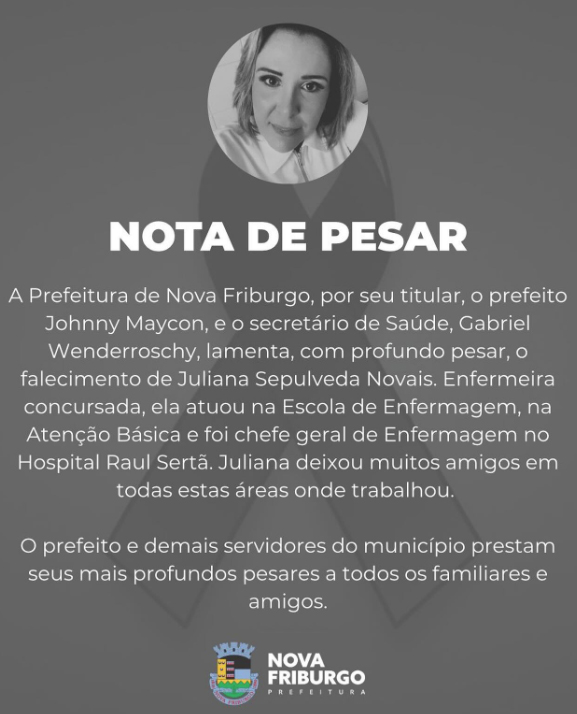 “A Prefeitura de Nova Friburgo, por seu titular, o prefeito Johnny Maycon, e o secretário de Saúde, Gabriel Wenderroschy, lamenta, com profundo pesar, o falecimento de Juliana Sepulveda Novais. Enfermeira concursada, ela atuou na Escola de Enfermagem, na Atenção Básica e foi chefe geral de Enfermagem no Hospital Raul Sertã. Juliana deixou muitos amigos em todas estas áreas onde trabalhou. O prefeito e demais servidores do município prestam seus mais profundos pesares a todos os familiares e amigos”.