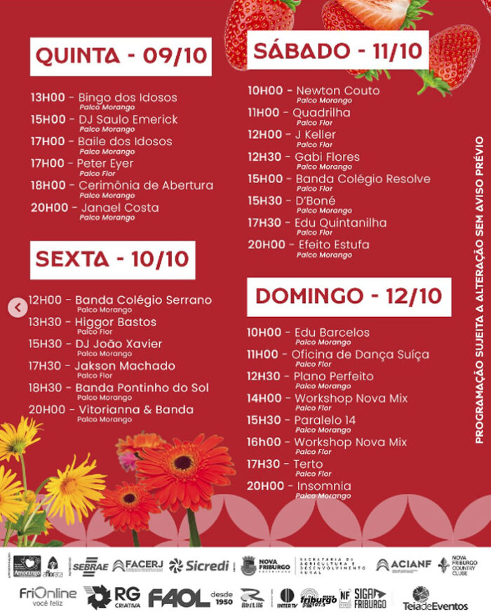 Entre os dias 9 e 12 de outubro, Nova Friburgo será palco da 11ª edição da Festa do Morango com Chocolate, uma das celebrações mais queridas da cidade.