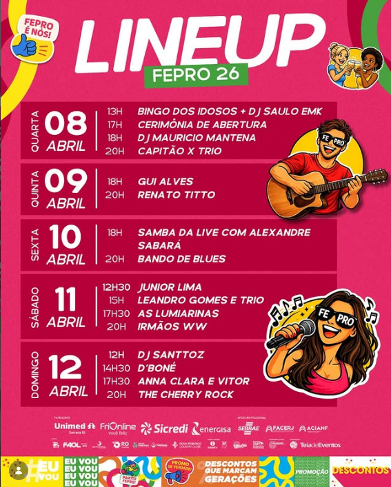 A FEPRO 2026 também contará com uma programação cultural diversificada, reunindo artistas locais e regionais em diferentes estilos musicais.