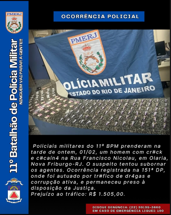 Policiais do 11º BPM (Nova Friburgo) prenderam em flagrante um indivíduo envolvido com o tráfico de drogas, na Rua Francisco Nicolau, em Olaria.