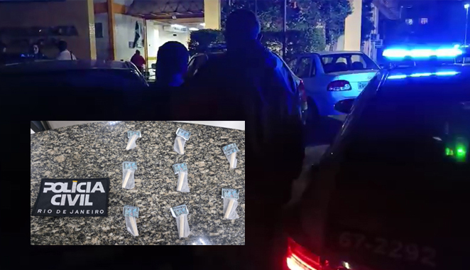 Durante a abordagem, ele foi flagrado com oito unidades de cocaína com a inscrição “CPX DA SUÍÇA CV FBG PÓ DE 30”, contendo ainda o símbolo da bandeira da Suíça e imagens de ratos, segundo a polícia, características de entorpecentes vinculados ao tráfico local.