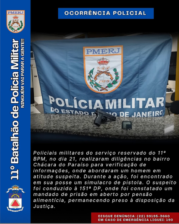 Policiais do 11º BPM (Nova Friburgo) prenderam, no último final de semana, um homem portando um simulacro (arma falsa) de pistola, no bairro Chácara do Paraíso.