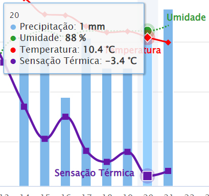 A ventania trouxe uma forte frente fria para toda a região e mudou radicalmente a temperatura. De acordo com o Instituto Inmet, a estação automática de Salinas, no 3º distrito, aferiu sensação térmica negativa durante 14 horas consecutivas, entre a tarde de sexta, 19/8, e a madrugada deste sábado, 20/8.