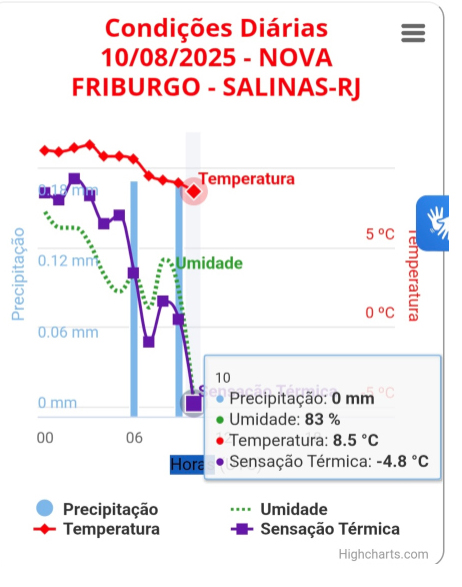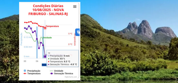 A estação meteorológica automática do Instituto Inmet aferiu mínima de 8.5 graus e sensação térmica de -4.8 graus no alvorecer de domingo, Dia dos Pais, em Salinas, na zona rural de Nova Friburgo.
