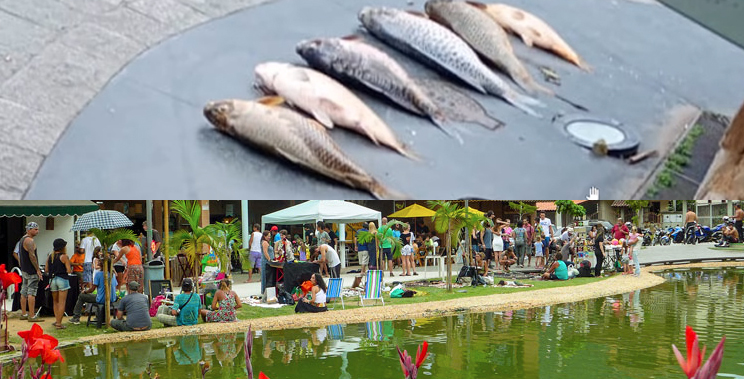 Uma nova mortandade de peixes está acontecendo no lago de Lumiar, no distrito turístico, desde o último final de semana. Dezenas de peixes têm aparecido boiando – e alguns chegaram a ser expostos na praça pública para chamar a atenção das autoridades.