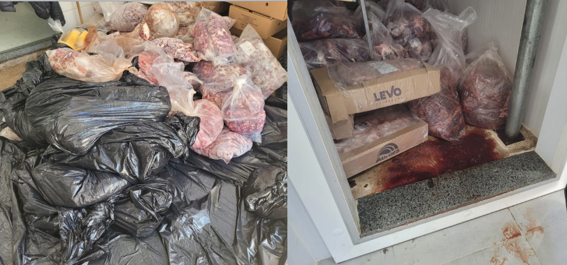 No frigorífico, foram apreendidos uma pistola 9mm sem registro, 640 quilos de carne imprópria para consumo e diversos queijos em situação irregular. Foram apreendidos, ainda, diversos cheques.