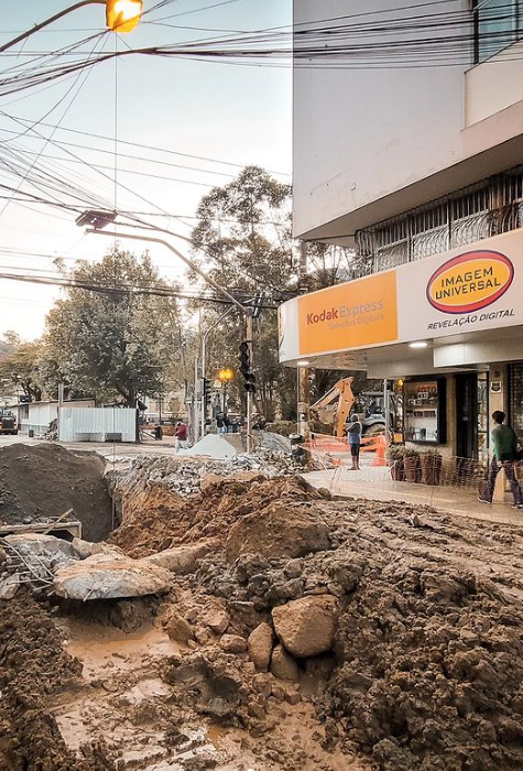 As obras de drenagem e ampliação da rede de captação de águas pluviais no centro da cidade – arcadas pelo governo estadual – chegaram na Rua Farinha Filho, no Centro de Nova Friburgo.
