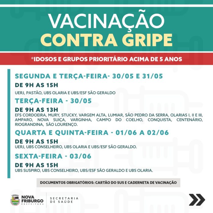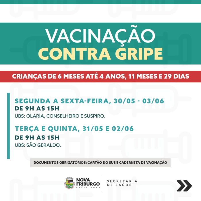 A Prefeitura continua oferecendo a vacinação contra a influenza em Nova Friburgo durante o decorrer desta semana. Crianças de seis meses até quatro anos, 29 dias e 12 meses podem receber o imunizante de segunda a sexta-feira nas unidades básicas de saúde do município.