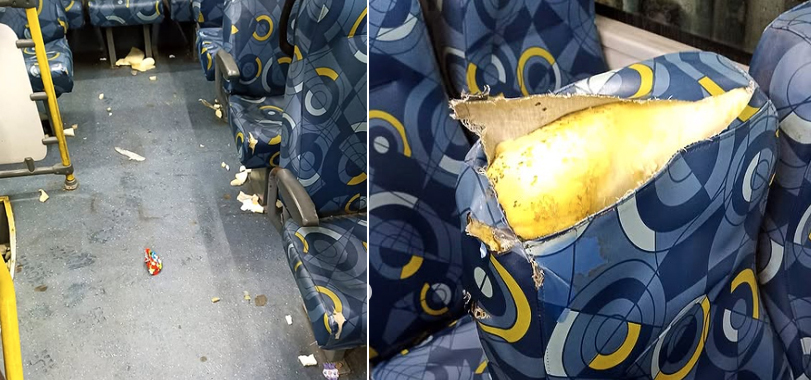 De acordo com a concessionária, “alguns estudantes de uma escola do distrito rasgaram os bancos, retiraram as espumas e sujaram todo o ônibus jogando diversos tipos de lixos, conforme imagens (veja em anexo)”.